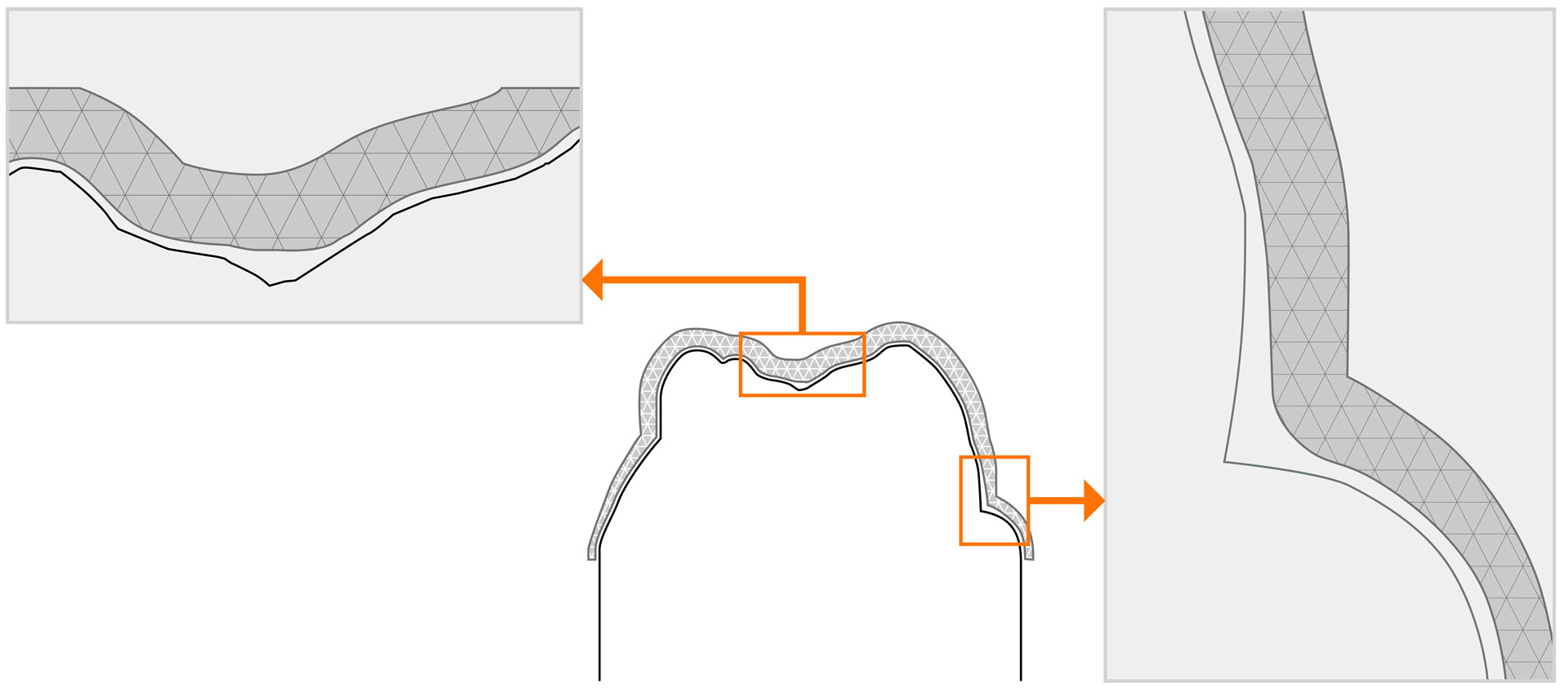 De dikte is uniform zoals ontworpen en de ondersnijdingen zijn volledig verbonden dankzij vormgeheugen.